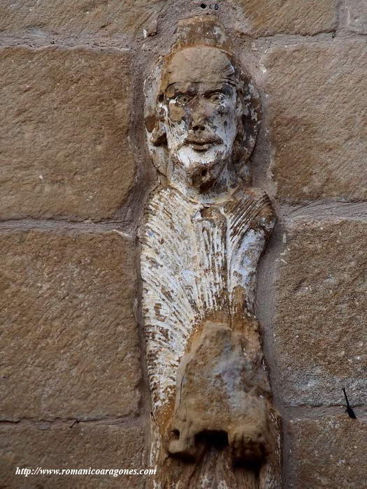 A los pies del muro sur hay una portada decididamente jaquesa (Imágenes 3 y 4). Se halla parcialmente oculta y dañada por un atrio de construcción posterior. Consta en la actualidad de un arco de medio punto dovelado apeado en jambas rectas cuyas dovelas van decoradas con una sucesión de palmetas en su porción más exterior. En origen tuvo otra arquivolta más. Se aprecia en la imagen 5 el resto de otro capitel por dentro del conservado así como la altura del desaparecido cimacio. Capitel y cimacio se rebajaron a escoplo para conformar la nueva jamba.