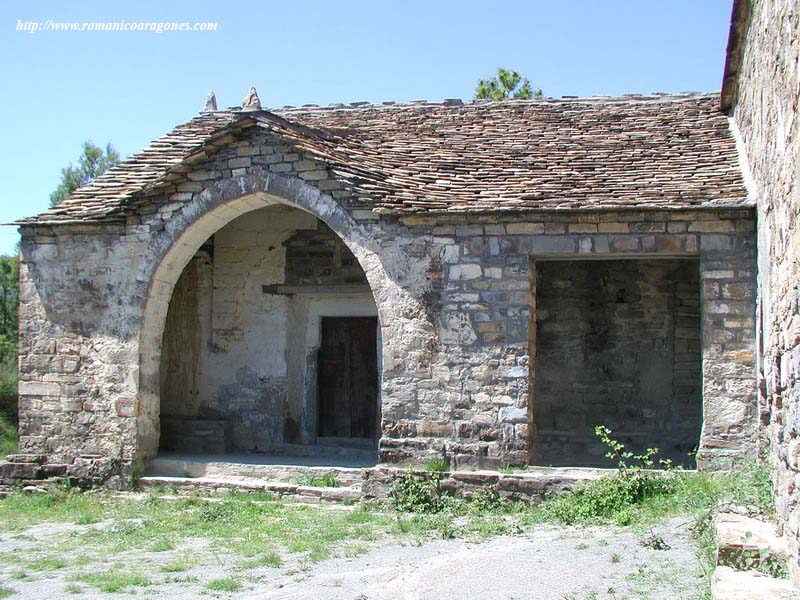 Al pie de la carretera Boltaña-Campo se sitúa la población de Arro. Frente a ella y en dirección a Sierra Ferrera y a San Victorián de Asán, a unos 2,5 Km y a pie de arcén de la carretera vieja, poco a poniente de la actual, se encuentra la ermita de la Virgen de los Dolores, románica del siglo XIII muy modificada cuya tardía construcción delata lo apuntado de sus bóvedas. Es templo de una sola nave con abundantes añadidos posteriores como el porche al sur, cobijando la portada que fue, y de la que queda un cuerpo resaltado del muro sur con signos de haber tenido un arco de medio punto grande (Imagen 5) (2002).