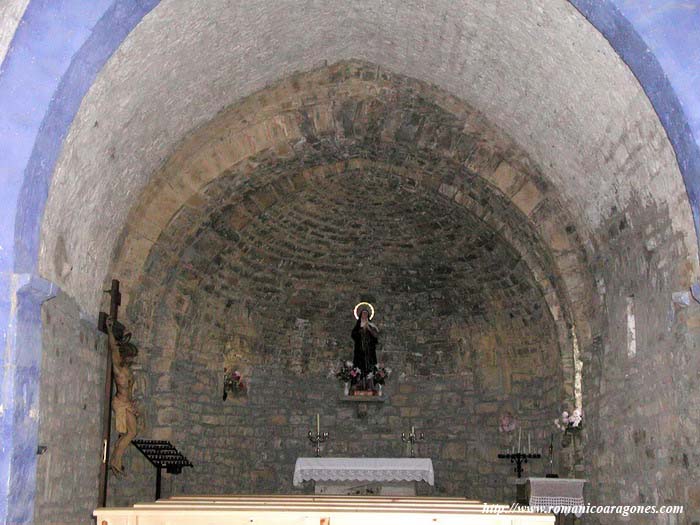 Por delante de una nave transversal añadida a modo de transepto, encontramos el cilindro absidal. Es de sencilla hechura a base de sillarejo y sus vanos son aspillerados y adintelados (Imágenes 3 y 4).