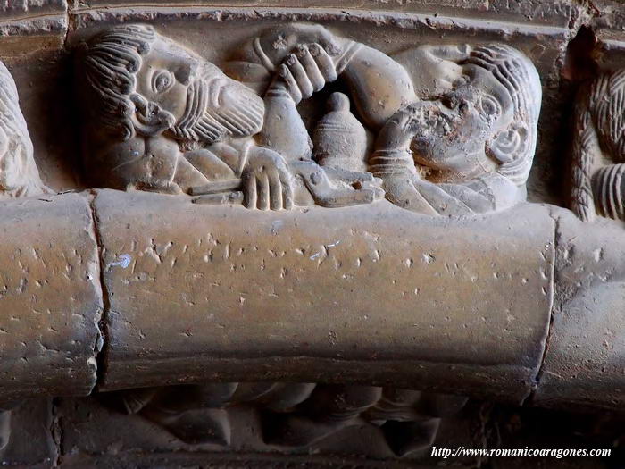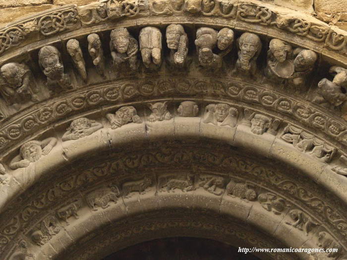 En las imágenes 1 a 9 muestro la decoración de las 17 dovelas de la arquivolta central cuyos personajes asoman por arriba y por abajo del bocel, así como las exteriores de la arquivolta interior. Se repite la idea del personaje orondo, sea hombre o mujer, asomado y apoyado de codos en el bocel. Es curiosa la escena de la imagen 2 que muestra a un sacamuelas armado de tenazas tras extraer una pieza a su "cliente", que no parece muy feliz de serlo.