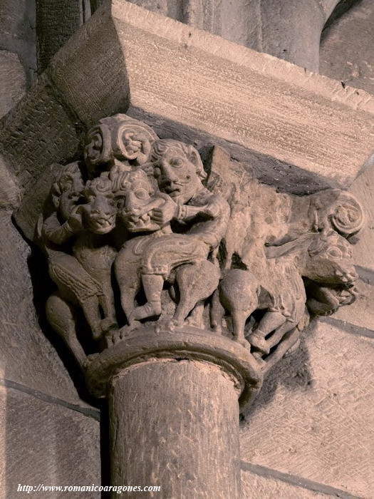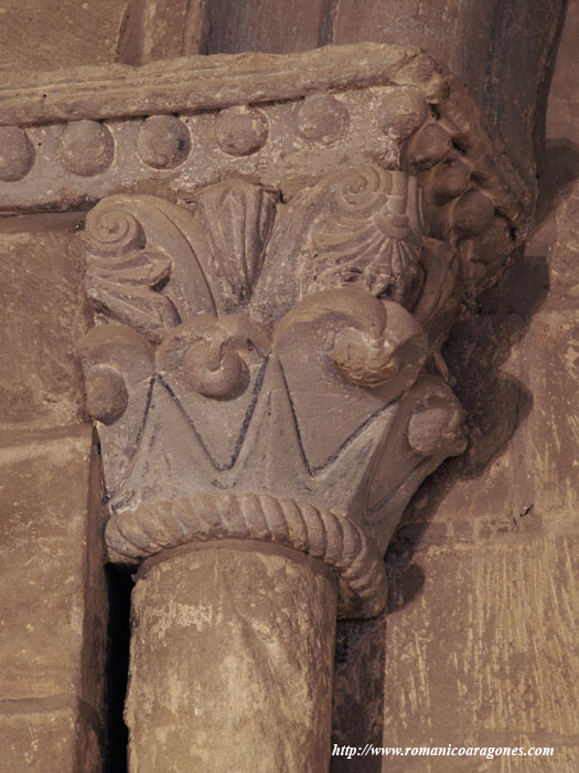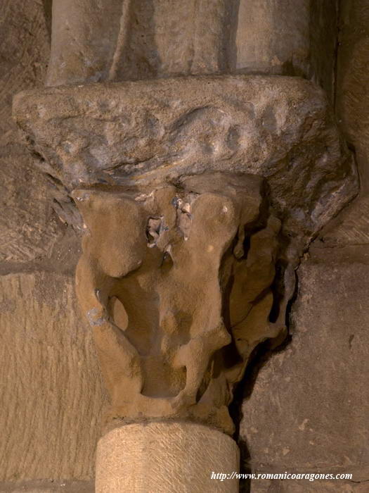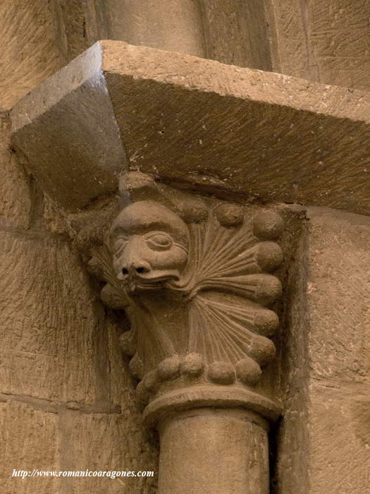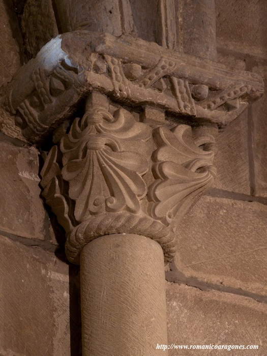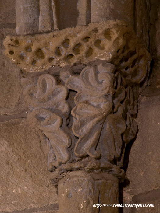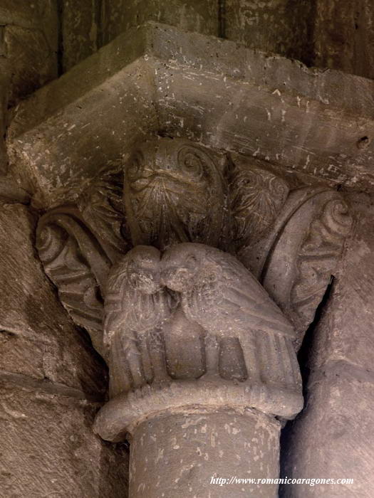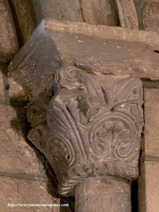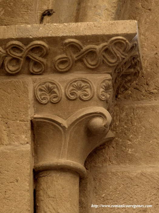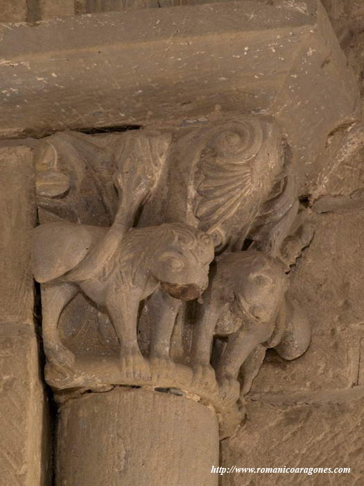 Las imágenes 1 a 12 corresponden a los capiteles del los arquillos situados en el cilindro absidal. Las dos últimas (13 y 14) son de la ventana del lado sur de la nave. Predominan los motivos vegetales tratados con gran precisión e incluso virtuosismo, como en el capitel grande que abre pagina. No faltan los leones como en las imágenes 3 o 6. La imagen 7 muestra una abigarrada lucha entre serpiente y grifo. La serpiente enrollada sobre si misma muerde el pico del grifo. La escena se repite en ambos lados de la cesta propiciando una simetría que confunde.