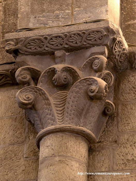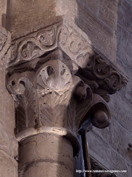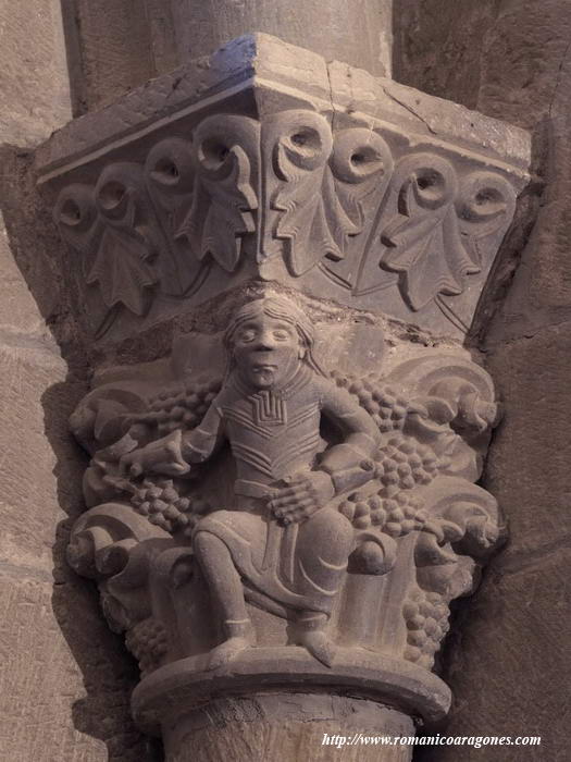Al interior de la magnífica portada sur hallamos una poco conocida arquivolta con dos magníficos capiteles, tanto por su magistral talla como por su estado de conservación propiciado por estar a resguardo de la climatología. Se trata de los mostrados en las imágenes 1 y 2. El situado a nuestra derecha muestra a un personaje sentado entre abundantes racimos de uvas (Imagen 1). Tiene su mano izquierda (maravillosamente esculpida) sobre la cintura y la derecha extendida reposando entre uvas. Destaca, como en el resto de las figuras, el tratamiento de las vueltas de sus bocamangas. No está comiendo ni vendimiando. Sencillamente parece estar mostrándonos su posición de dominio o poder sobre las vides.