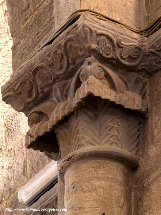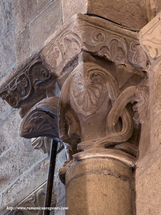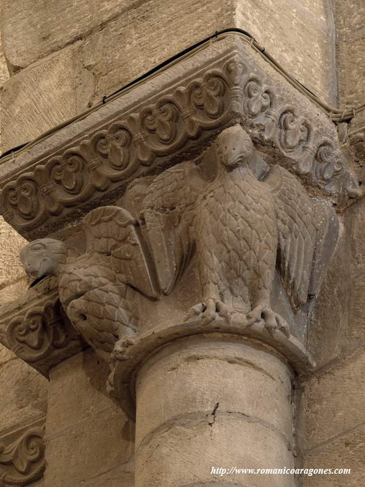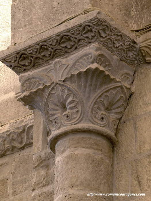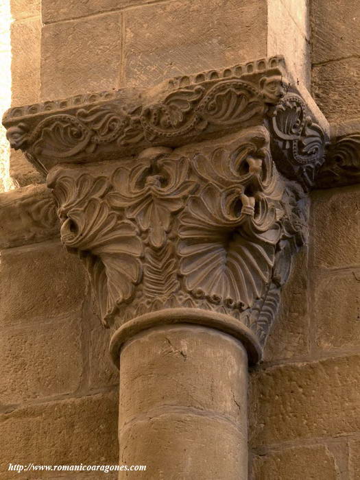 A continuación, las imágenes 3 a 12 muestran los capiteles que coronan las semicolumnas adosadas sobre los que voltean los fajones del templo. Volvemos a encontrar águilas o motivos vegetales de fina labra en algunos de los que el tallista demuestra virtuosismo al vaciar la piedra como en el de la imagen 5.