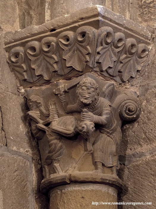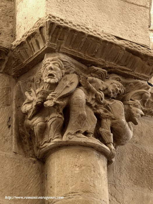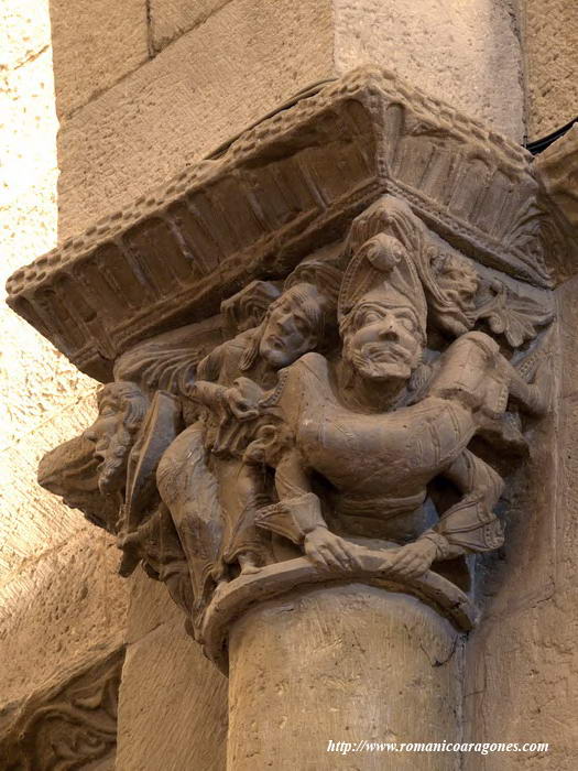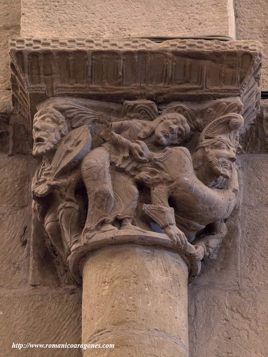 Frente al capitel anterior, a nuestra izquierda, hay otro capitel en que la escena nos muestra a un personaje dispuesto a decapitar a un demonio con cara de ave (?) al que tiene tomado por el pelo, mientras que un segundo demonio le sujeta sus manos a la espalda (Imagen 2).