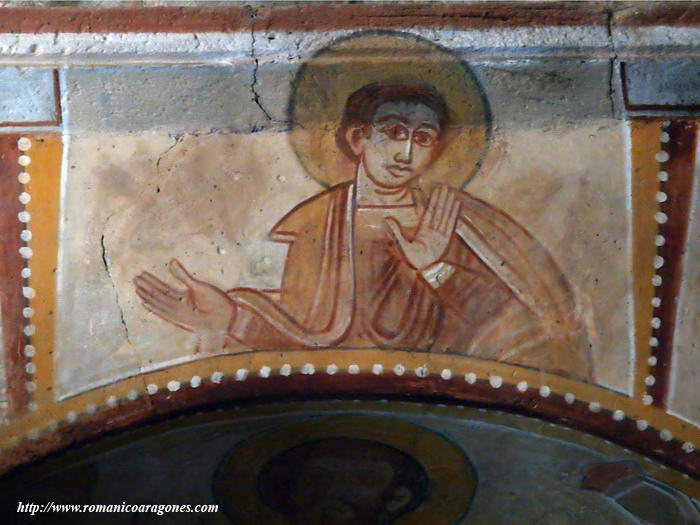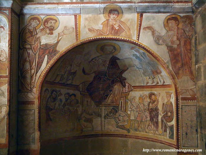 Ocupando la zona sobre el absidiolo hasta la imposta se muestra una infrecuente imagen de Cristo imberbe con dos de sus apóstoles a cada lado, quizá evocando el pasaje en que Jesús recluta a sus discípulos (Imágenes 2 y 12).