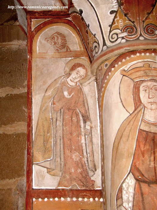 El absidiolo sur mantiene sus pinturas en un aceptable estado de conservación. Está decorado desde la tercera hilada de sillares hasta la imposta incluyendo columna, capitel y pilastra. Durante tiempo la interpretación de este ciclo pictórico ha sido errónea viendo a Cristo en Majestad en la gran figura que centra el absidiolo.