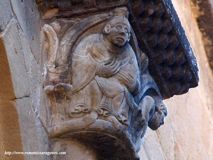 El capitel de la izquierda representa el pecado original. Se nos muestra a Adán y a Eva, con expresión compungida y con las manos tapando su bajo vientre. En el centro está la serpiente enroscada al árbol y ofreciendo a Eva, en la otra cara del capitel, la fruta prohibida mientras que Adán a su lado se sujeta la garganta (Imágenes 5 a 7). En el capitel del lado derecho, sendos monjes sedentes en sus ángulos nos contemplan con una mano sobre su pecho. Sobre ellos hay decoración de arcos y lacería (Imágenes 8 y 9).