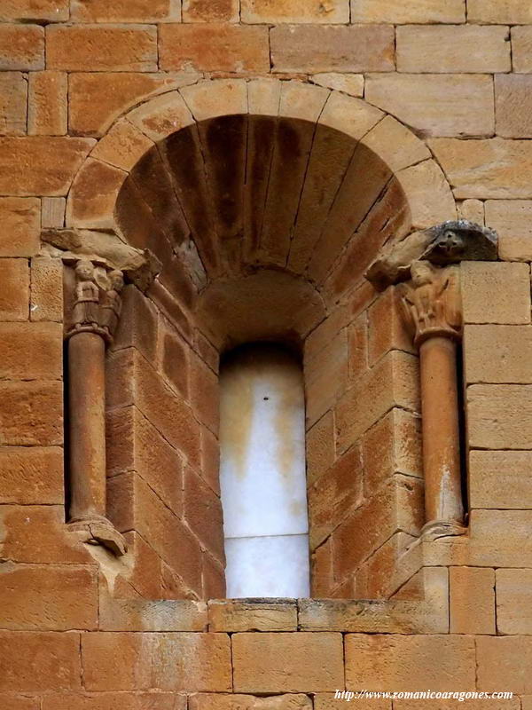 Después de disfrutar, fotografiar y acariciar el capitel de la cripta de Murillo para sentir el delicado acabado de la pieza, doy un paso atrás, abro mi campo visual y me quedo atónito ante la ventana que lo contiene. ¡Maldita sea!... ¿Pero eso es un vano románico?. Cansado de explicar que en el románico el arco de medio punto se emplea para casi todo, van las gentes que hicieron esta cripta y se les ocurre hacer un vano adintelado, rehundido y perfilado por la imposta y cuyas columnillas no apean arquivolta sino dintel moldurado que enmarca estrecha aspillera.