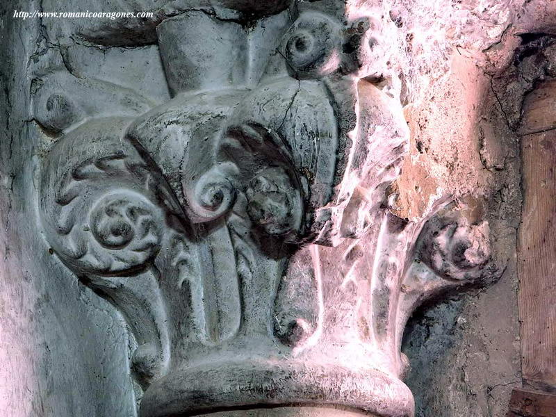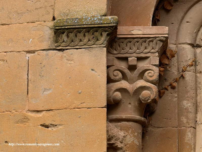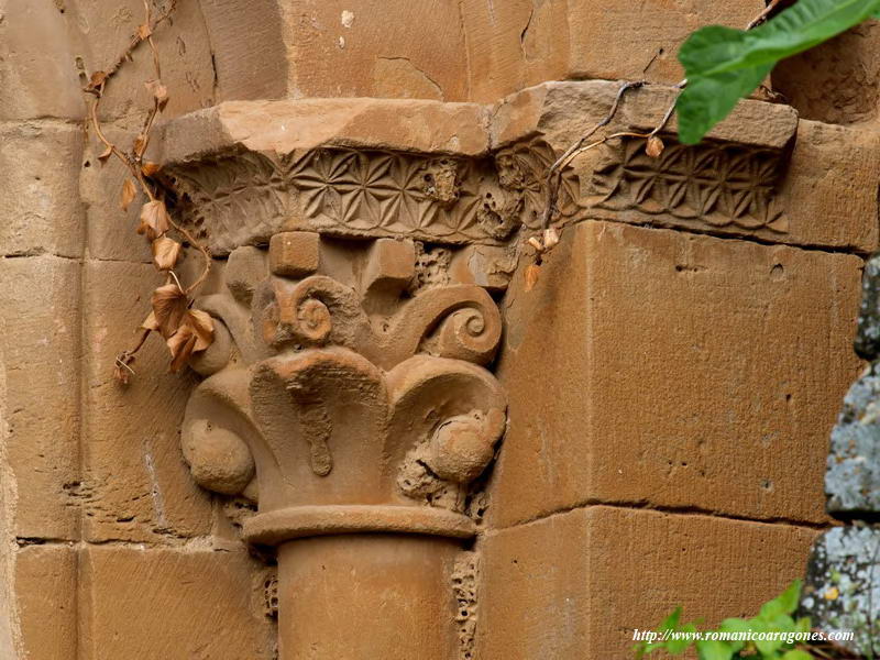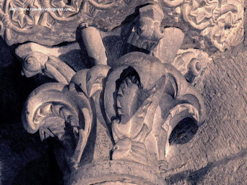 Los capiteles de las imágenes 14 y 15 corresponden al exterior del ábside norte del monasterio cisterciense de Casbas de Huesca fundado en 1173 y los traigo aquí porque sus cimacios comparten estilo decorativo con la moldura interior del ábside de Agüero y semejanza con el cimacio del capitel que muestra una cabeza coronada.