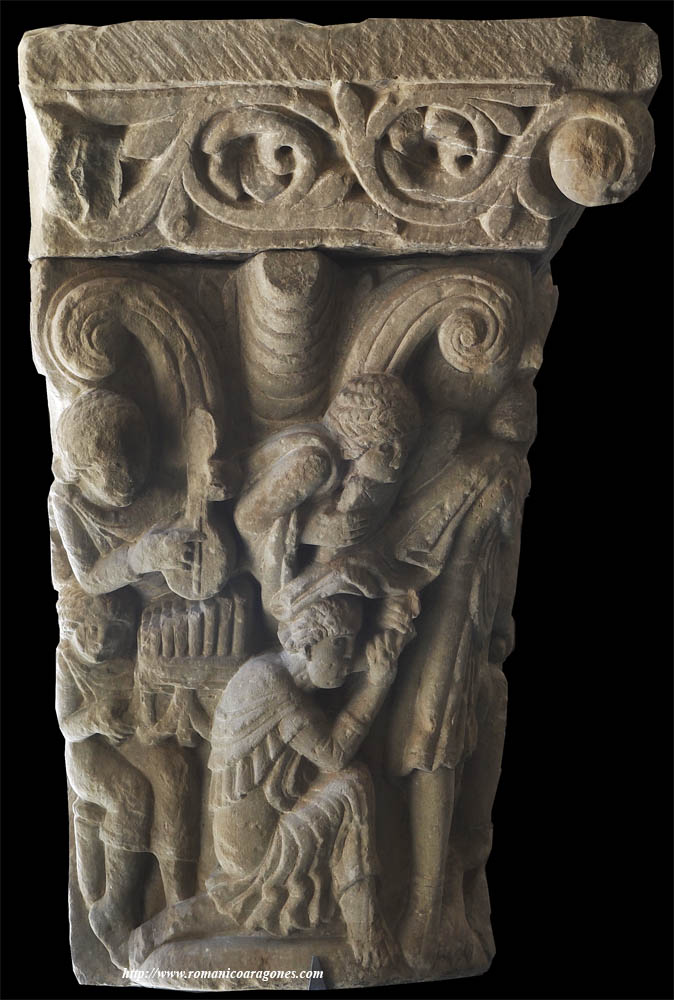 El capitel deriva del modelo corintio al que nos remite por medio de sus volutas decoradas con incisiones. El apeo para el ábaco luce decorado sogueado en tres de las cuatro caras y a sus lados, en la cara frontal, vemos elementos vegetales flordelisados. En la cara posterior, que hemos podido ver tras su restauración y traslado (imagen 65 c) podemos advertir la decoración a base de dos volutas planas que arrancan de lo alto del inicio de la cresta posterior del capitel, que muestra señales toscas de su trabajo. Las volutas lucen también dos incisiones paralelas y bajo su extremo enroscado vemos tres foliolos vegetales componiendo un elemento flordelisado. El espacio entre ellas, al igual que el de la cresta posterior, muestra el trabajo tosco de las herramientas del cantero así como dos líneas paralelas de trabajo señalando la anchura de la mencionada cresta a lo largo de toda la pieza. El resto de los detalles de los músicos que acompañan al rey David están explicitados en este monográfico.