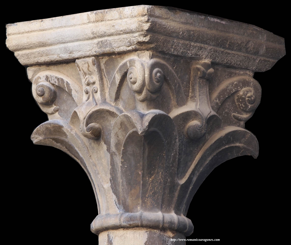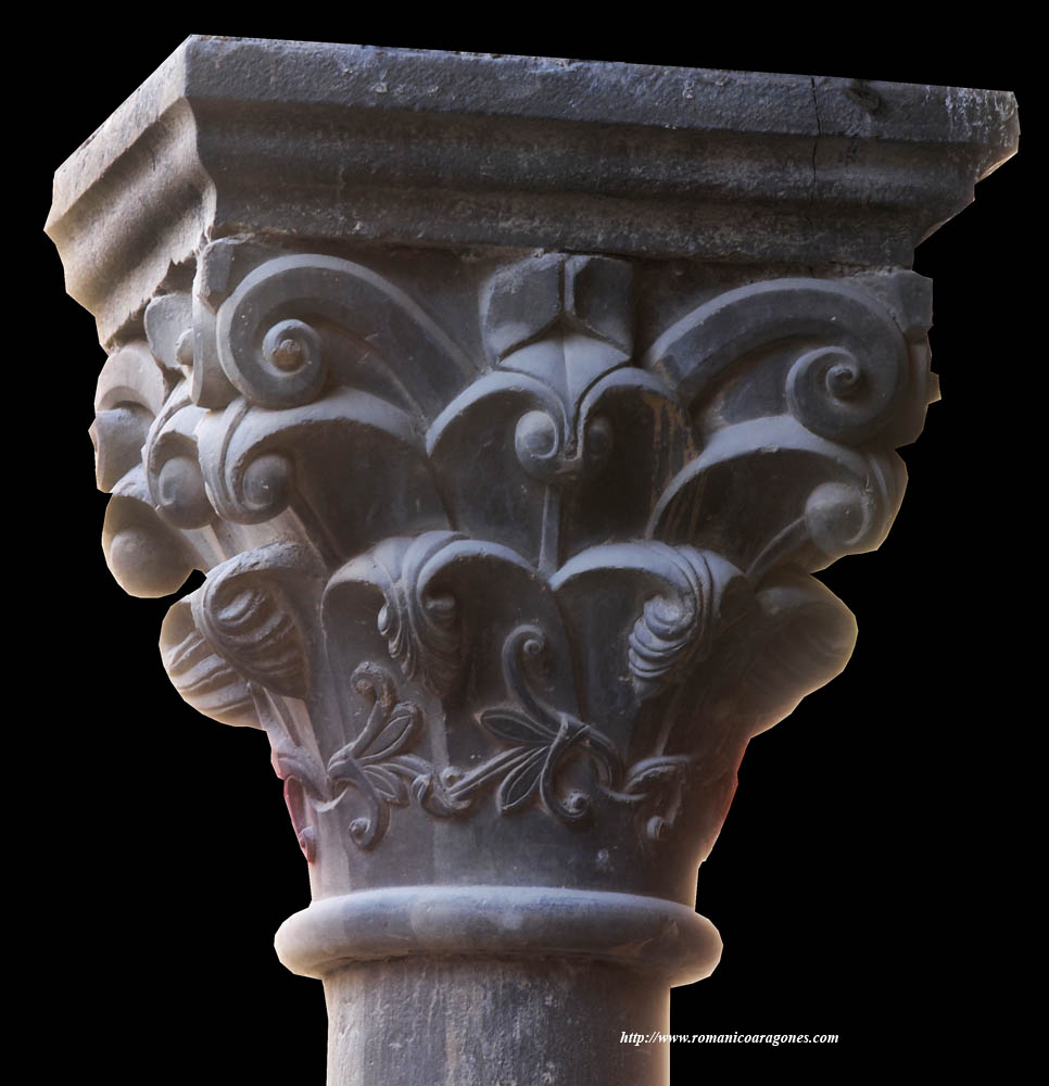 El ábaco luce una sucesión de roleos vegetales formando círculos dentro de los cuales se despliegan foliolos radiales. Las esquinas anteriores están decoradas por medio de bolas parcialmente cubiertas en su porción superior por una prolongación picuda de los mencionados roleos.