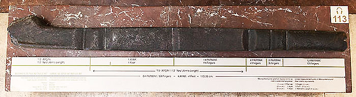 El más antiguo vestigio conocido de lo que señalo se documenta en la antigua ciudad sumeria de Nippur donde se encontró una barra de aleación de cobre con marcas para estandarizar longitudes (Imagen 8). Se le supone una cronología aproxima al siglo XXVII a. C. y se conserva en el museo arqueológico de Estambul. Su función fue la de establecer un patrón invariable de medidas tratando de estandarizarlas. Realmente es el antecesor más remoto de la vara jaquesa que estamos considerando.
