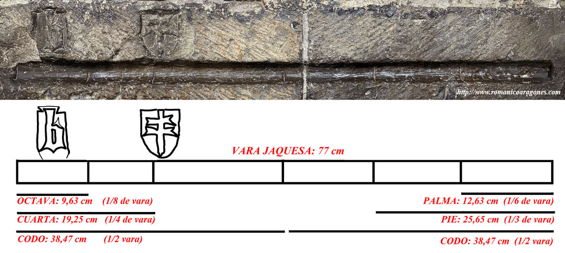 En la imagen 9 muestro una composición a base de la fotografía de la vara jaquesa labrada en la portada meridional de la catedral de Jaca, con sus segmentaciones y timbres que le aportaron legitimidad. Ya he comentado que mide 77 cm y está dividida por cinco muescas de modo que en la misma pueden considerarse diversas medidas como la octava o la cuarta (octava o cuarta parte del total de la vara), el codo, el pie y la palma. Esta última no hay que confundirla con "palmo". En la vara se refiere a la anchura de la palma humana, equivalente en anchura a la de los cuatro dedos que de ella emergen.